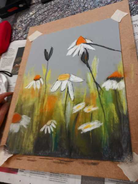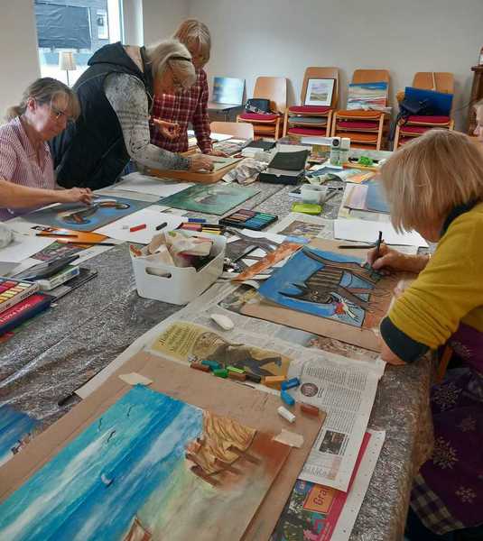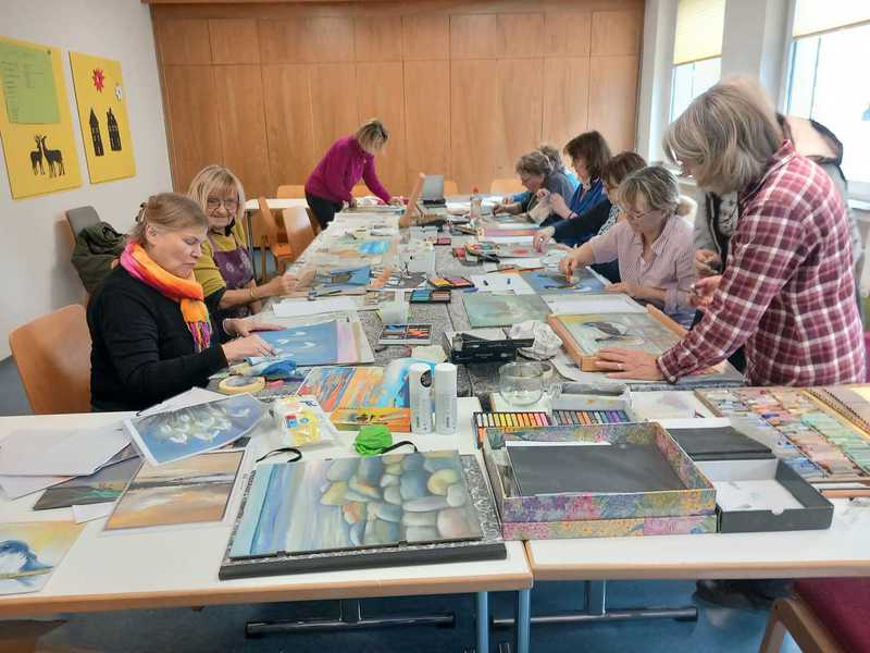 Unser zweiter interne Workshop war der Malerei mit Pastellkreide gewidmet. Erika Diederich leitete den Kursus und erläuterte die Besonderheiten des Malens mit Pastellkreide. Nicht alle Teilnehmerinnen hatten dieses Medium schon angewendet und so war es schon eine Herausforderung. Wir waren voll konzentriert und mit unseren gelungenen Werken zufrieden. Hier einige Eindrücke von den entstehenden Werken. Die Nuancen müssen noch aufgebracht werden.