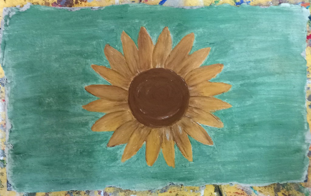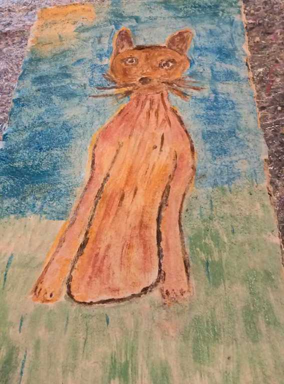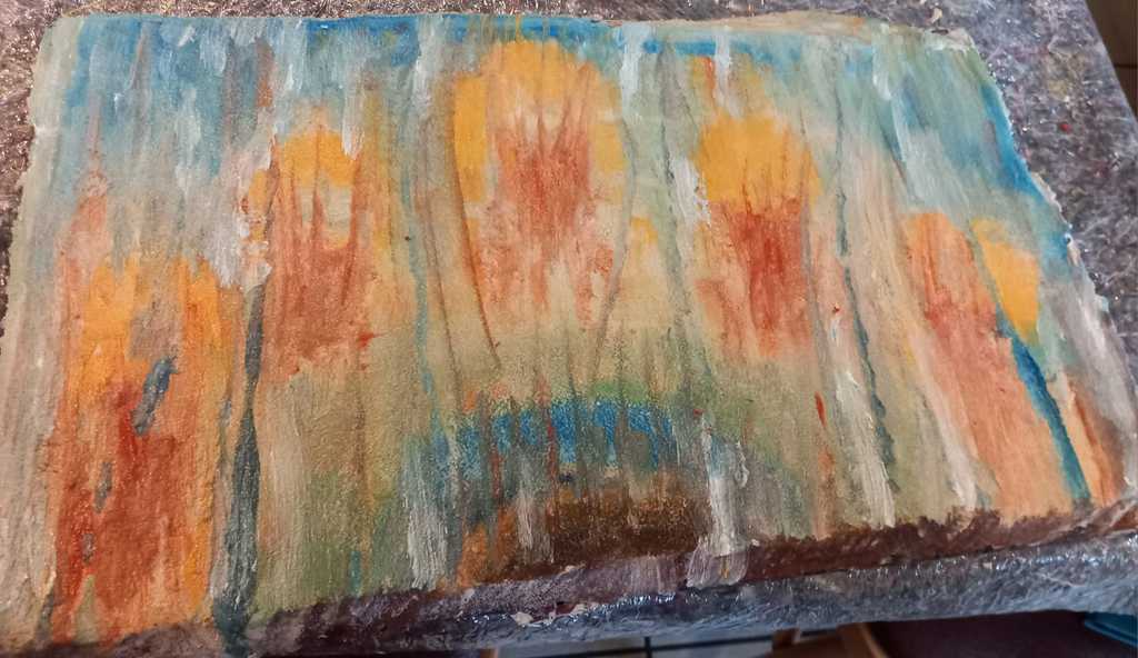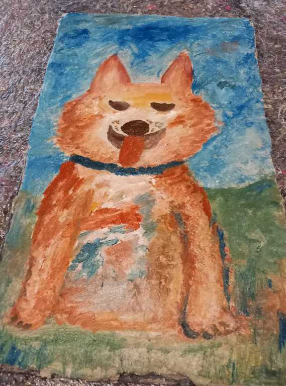 Die Vorbereitung war viel Arbeit. Auf die Schieferplatten mussten mehrere Schichten Putz aufgetragen werden. Diese Vorarbeit hat Hans Pfingsten seiner Garage für uns vorgenommen. Monika rührte abends schon die Pigmente an, damit wir am nächsten Tag sofort mit dem Malen beginnen konnten. Das Ergebnis seht ihr hier: